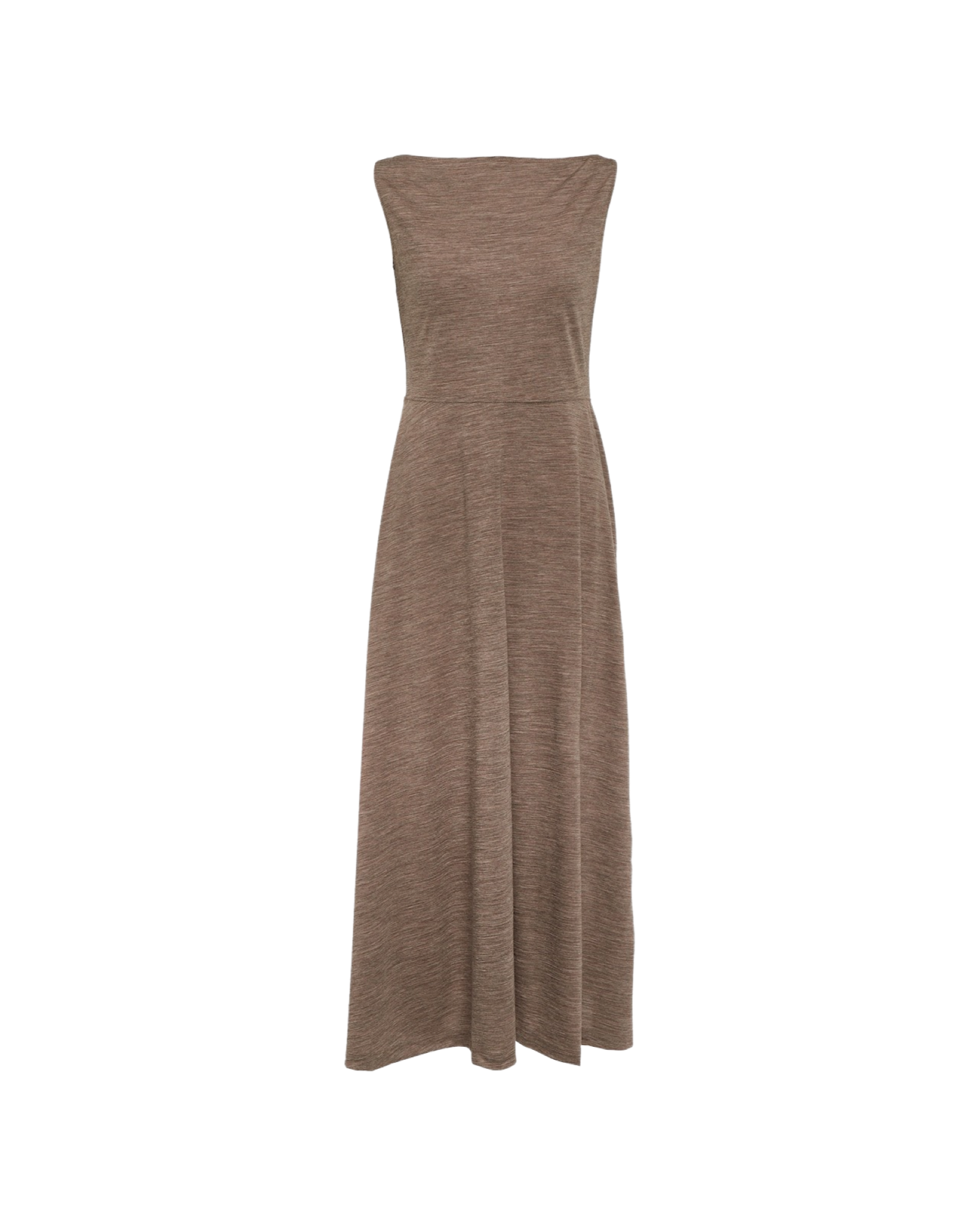 The collection includes three speckled knits: one light grey crew neck, a pair of charcoal track pants and a v-neck with removable sleeves that becomes a vest. There is also a light brown flare skirt (which I like best styled with pants underneath) and a darker brown dress with a crew neck and rounded, long sleeves.